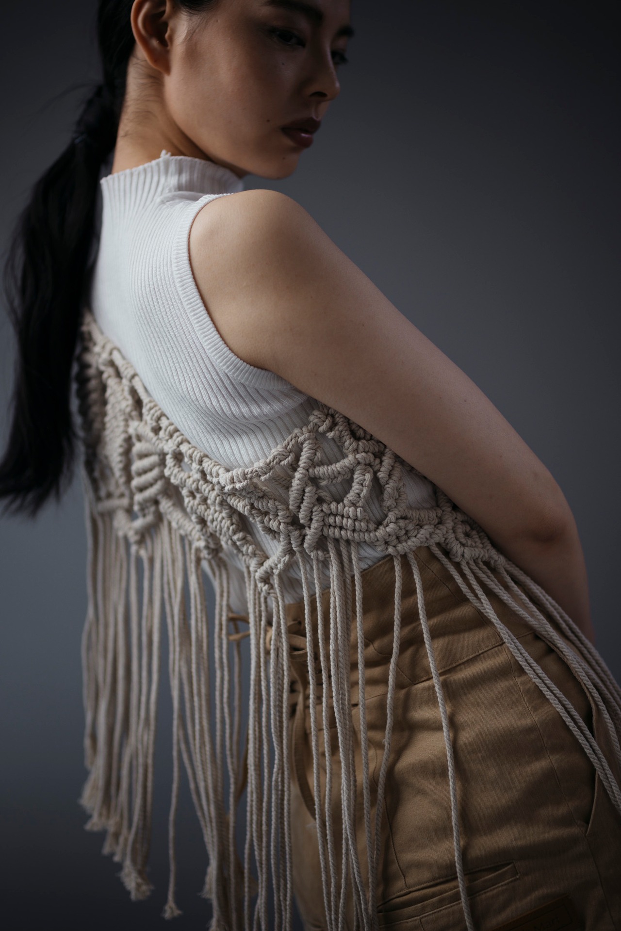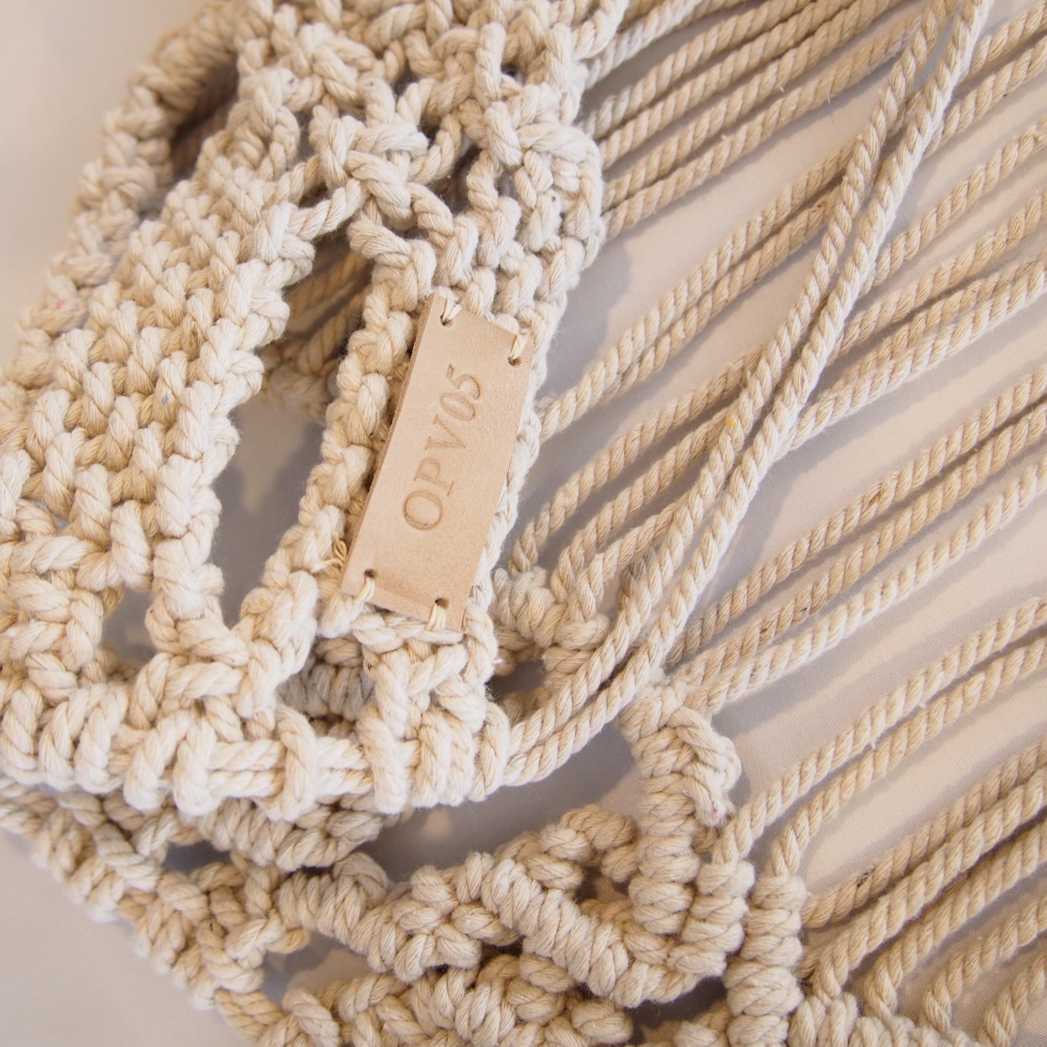 Shoulder strap made with macrame knitting. Uses unbleached natural cotton found in India. Design, knitting method, fringe length and curve design. Repeated trial production, longer, shorter, this design is good for this knitting method, It is completely different from bleached cotton. Packed with a lot of commitment In addition to shoulder use, you can wrap it around your waist or use it as an interior decoration. It has become an item that we want everyone to find many uses for and enjoy. *Because unbleached cotton is used, if you look closely, you can see black dots here and there. ■ size / length approx. 50cm, width approx. 70cm (macrame knitting part only) There is a string for tying on both sides. The string is about 70 cm on one side. ■ Model height 163cm